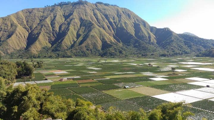 The perspective from 637 m over the towns and fields of Sembalun Lawang and Sembalun Bumbung is of the superb display of the old caldera of Mt. Rinjani.